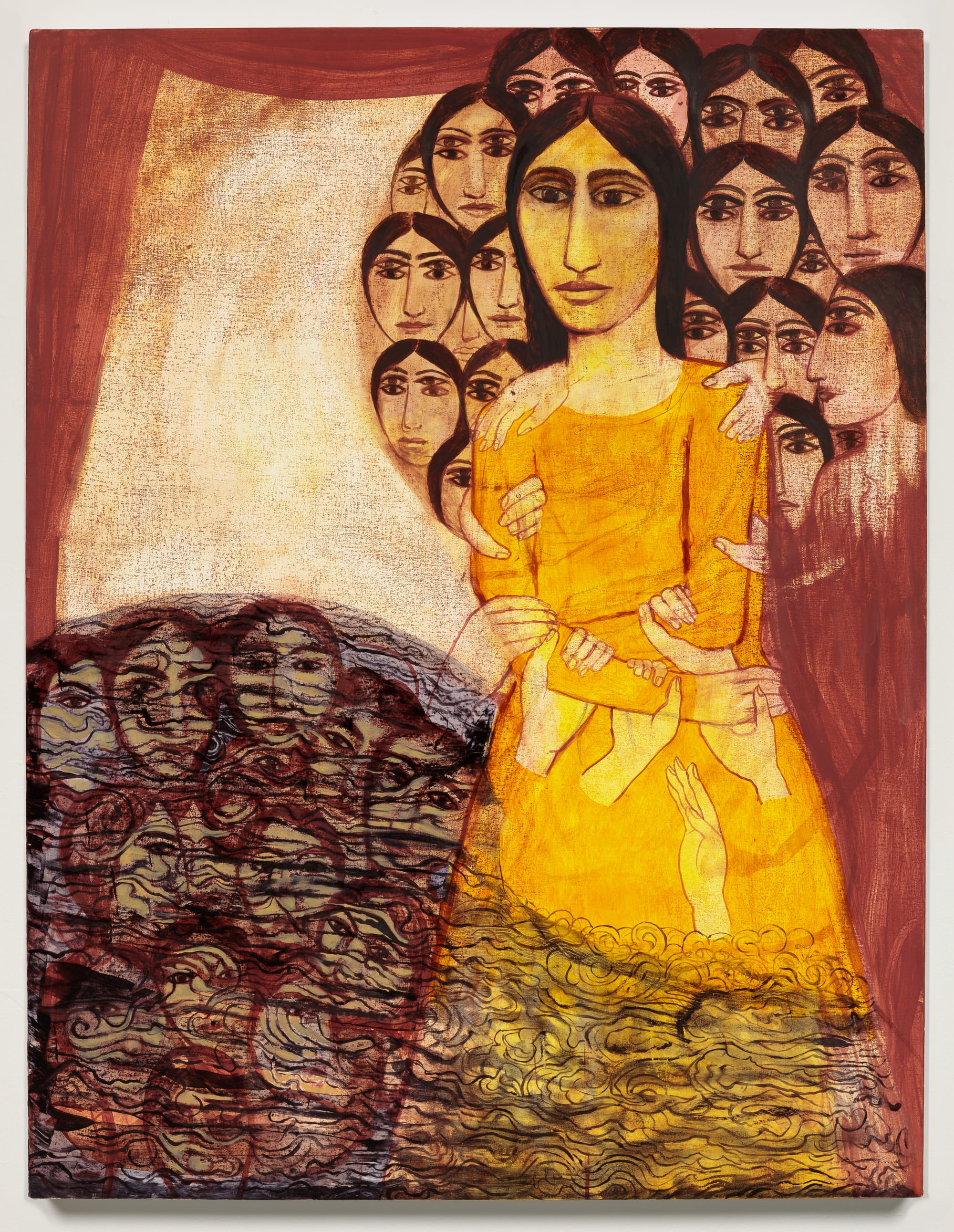 Three women working in painting, textile, and embroidery create a shared study of generational consciousness. Named after a painting by Abbassy, Carrying the Effigy elides any simplistic understanding of femininity and spirituality. Many-headed women gaze at animalistic and human-like forms in Abbassy and Sung’s paintings, which respectively draw from ancient Iranian and Chinese traditions. Meanwhile, Brangam-Snell’s designs show disembodied hands grasping at elusive household objects. In this setting, the “effigy” theme symbolizes not just fire and anguish, but also love and solidarity.
