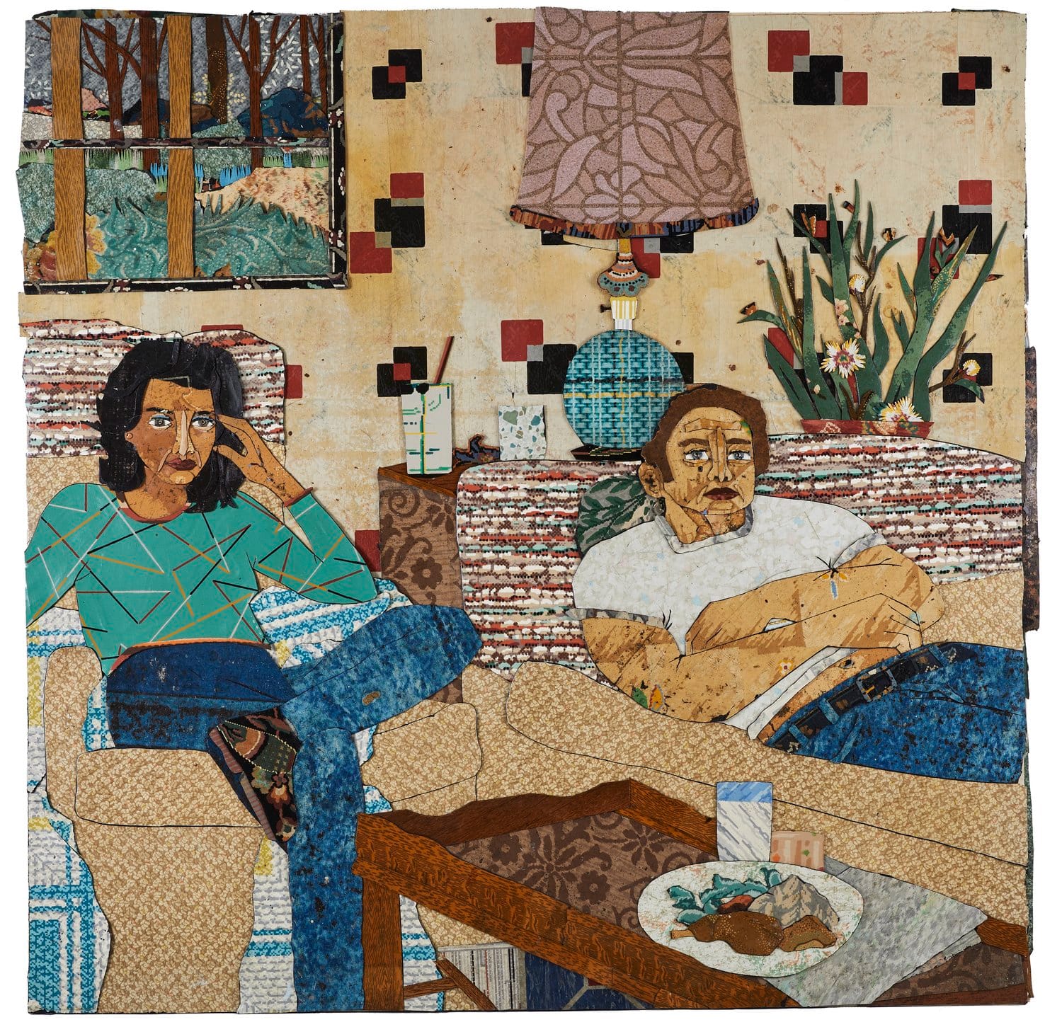 Bill Miller creates his landscapes and domestic scenes using linoleum lifted from long-abandoned households. In a collage style akin to Romare Bearden or Hannah Höch, Miller weaves together gentle scenes of blue-collar life. Inspired by his own family history — both his father and grandfather perished in Pittsburgh industrial accidents — these proletarian tapestries use found materials to salvage the memory of working-class intimacy, with overlapping patterns symbolizing the myriad outcomes that befall everyday workers. Images of family, nature, and home seem less a reinforcement of traditional values than a ritual return to bygone places.