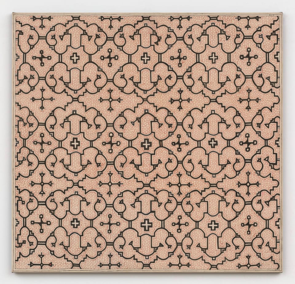 Peruvian artist Sara Flores is a master of kené design, which transforms local flora and fruit into complex geometric patterns seen across pottery and textiles. Rooted in traditions from the women-led Shibipo Nation, these serpentine compositions draw from the tail of a mythical anaconda named Ronin, who is known as the “mother of all mothers.” Equally hallucinatory and meticulous, Flores's earth-toned paintings reveal connections between the natural world and Indigenous design, which the fashion and art industries continue to appropriate today.