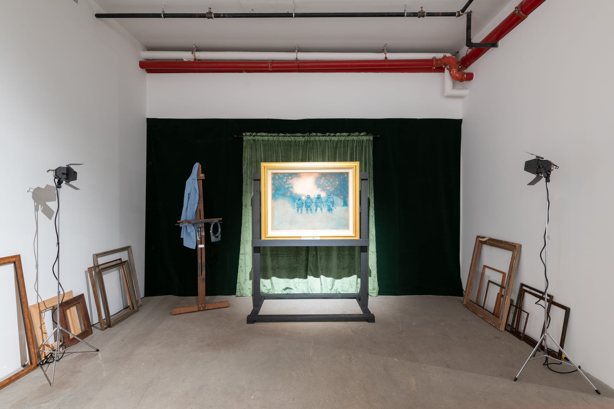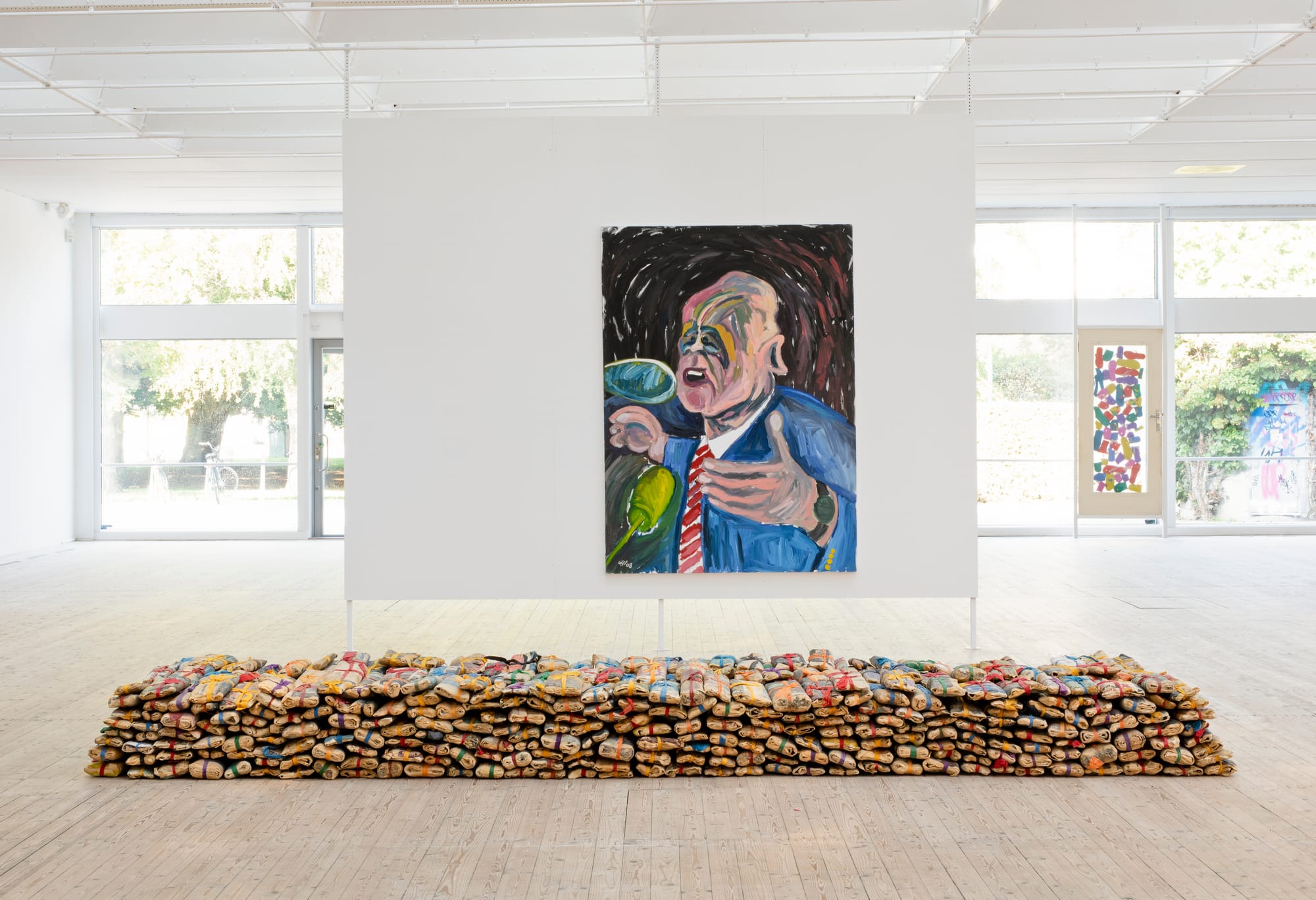 Emirati conceptual artist Hassan Sharif (1951-2016), who worked across media but is most closely associated with his sculptural installations of refuse, gained recognition for his political caricatures and cartoons in the 1970s. Highlighting that critical figuration remained an important thread in Sharif's mature work, the late, Expressionism-inflected paintings on view depict decontextualized, distorted politicians who appear maniacal at press conferences or raise their hands in ambiguous public gestures emptied of meaning.