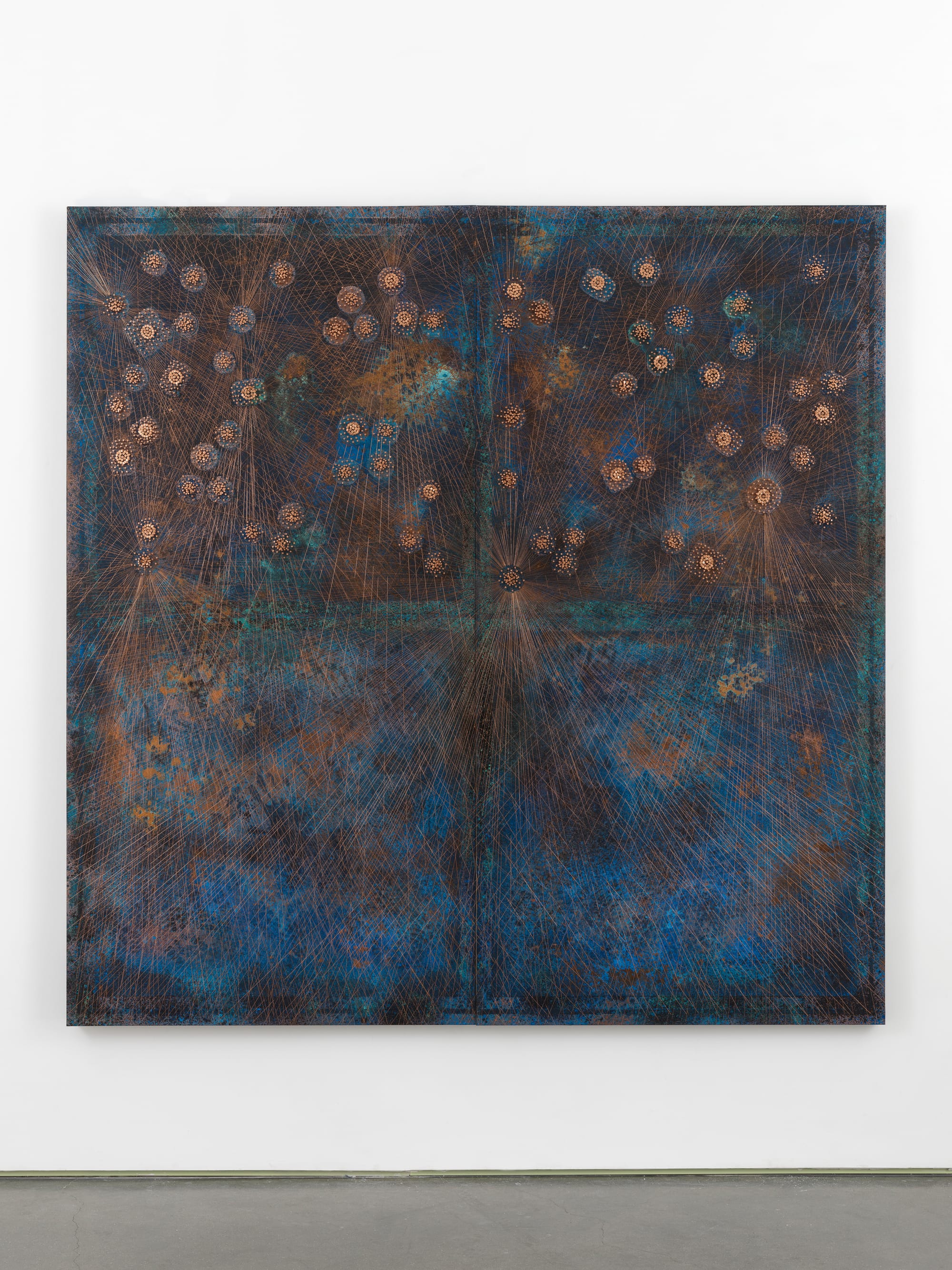 Breaking down divides between the street, the studio, and the gallery, Ward incorporates found materials from his Harlem neighborhood into these recent works. Among the exhibition's offerings are a large-scale installation with still life arrangements atop step ladders, wall-bound shoelace-based text pieces that reference Claude McKay’s powerful 1919 poem “If We Must Die”, and large copper panels that are patterned off the crosses that form on sidewalks and feature material derived from the street memorials that became particularly prevalent during the COVID-19 pandemic.