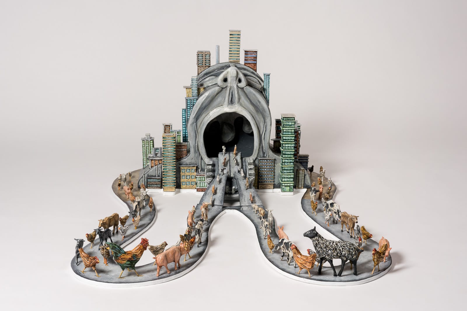 A group exhibition and festival dedicated to cooking examines the effects of colonialism and industrialism on global cuisine. Taken from the Arabic word for spirit, which according to resident artist Reem Kassis carries a dual context in cooking, Nafas brings together mixed media by more than 30 contemporary artists. Displayed across the main gallery of Invisible Dog, these works are less of a smorgasbord and more a vivid tableau of cultural resistance. Jude Griebel’s factory farming sculptures, Chang Ya Chin’s paintings of personified dumplings, and Khaled Hourani’s Palestinian watermelon are just a few of the offerings at this table.