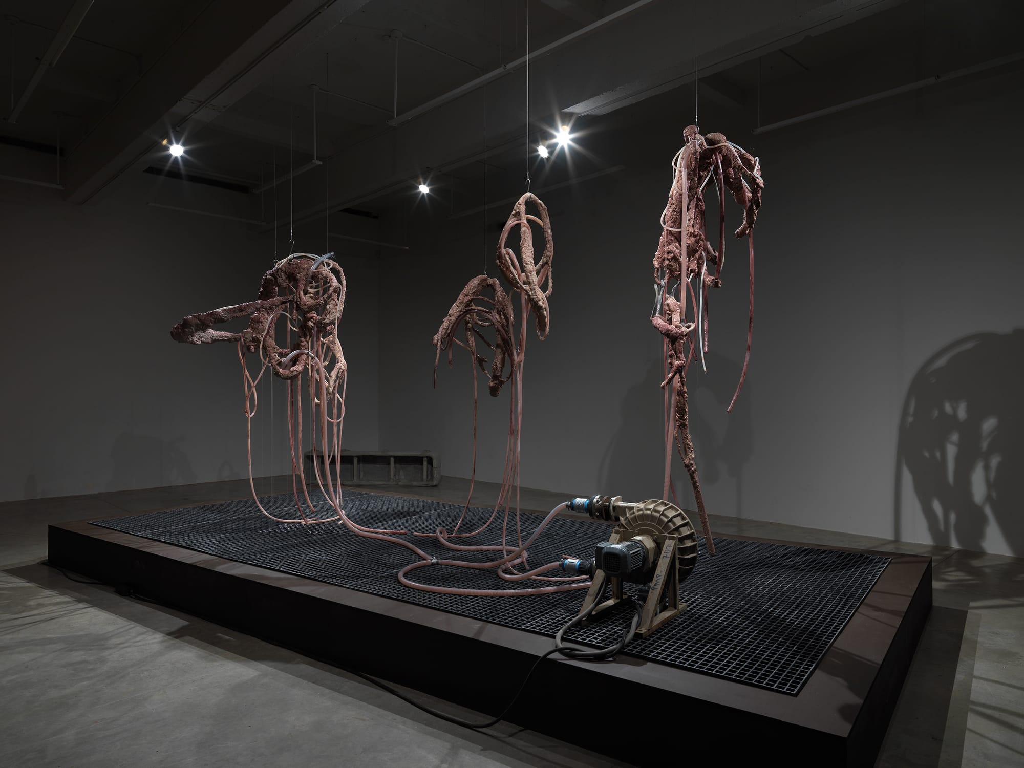 The centerpiece of Mire Lee’s latest exhibition appears behind a wall of concrete molds, wherein hanging silicone tendrils spew and circulate liquid through a hose pump. This dark, dank setting for such an apparatus feels biological and industrial, bringing to mind how humanity develops systems in its own bodily image. Lee’s “carriers,” which take on digestive elements, can thus stand in for the subsuming of the oppressed by the oppressor, the hunted by the hunter, or the mind by the machine. In this way, Lee presents a keen allegory for the artist’s relationship to their labor. (Read John Yau's review of this exhibtion for Hyperallergic).