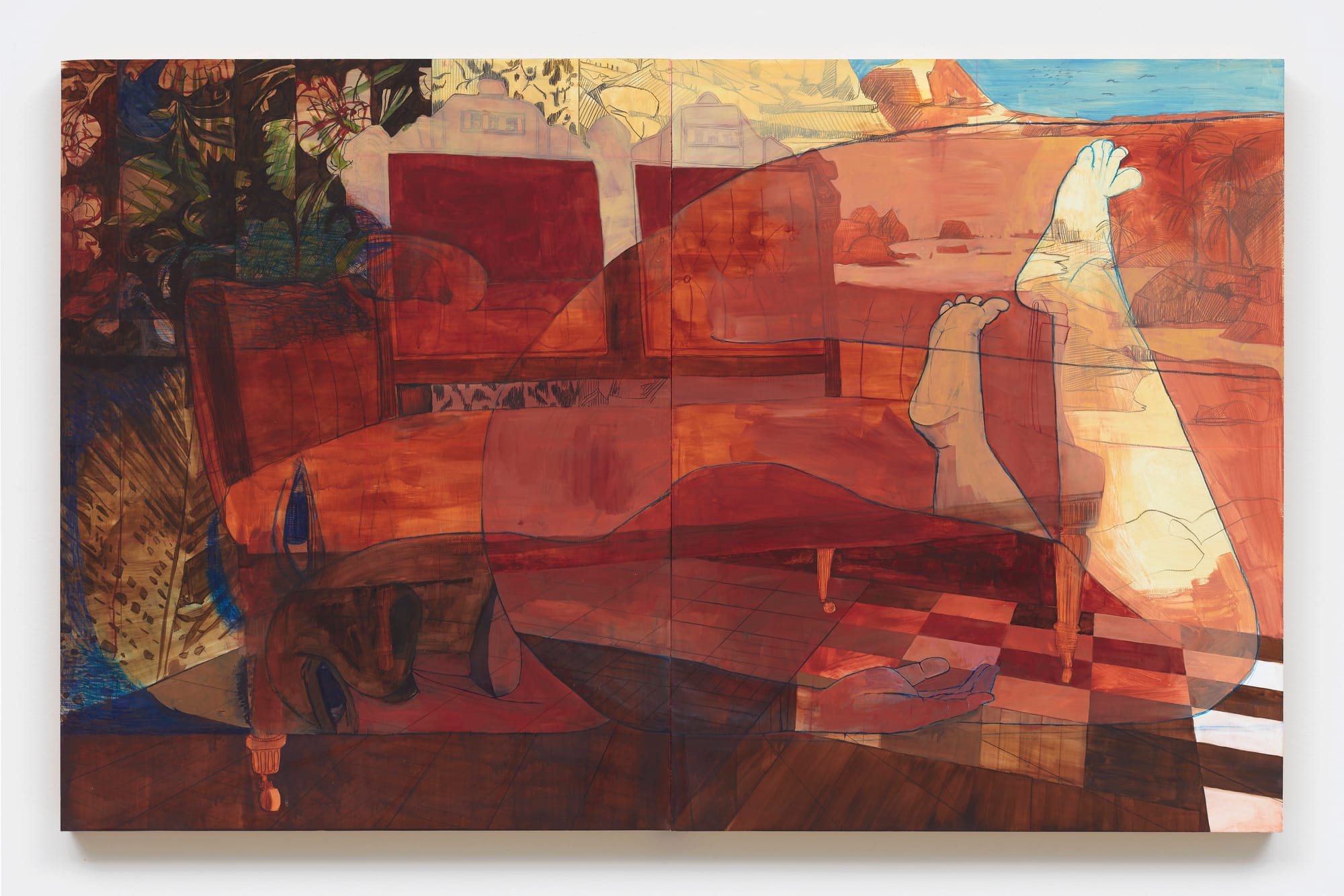 Pamela Sunstrum has already lived many lives in the United States, Africa, and Southeast Asia. But as her latest exhibition title reveals, much of that experience has yet to be expressed. Thus, the individual painted canvases that comprise I have withheld — many of which are paired into diptychs or built into three-dimensional installations — together form a surreal tableau of placelessness. Sunstrum layers denim jeans, volcanic mountains, palm trees, and checkered tiles into visions of kaleidoscopic splendor, as if drawing from overflowing wells of memory. Perhaps, then, the artist is more prepared to speak than she lets on.