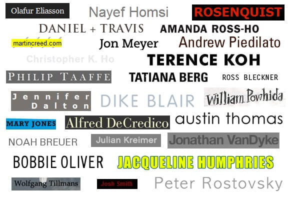 Artist websites typically attempt to remain as neutral as possible, taking most of their design cues from commercial gallery websites. White, gray and black backgrounds are preferred, with ultra-simple and typically understated logos that consist simply of the artist’s name — not unlike a luxury brand such as Thierry Mugler, Chanel, etc. Sans serif fonts are generally preferred over serif; gray text preferred over black; the less visual noise the better. Works are typically isolated on the white background of the website itself, rather than viewed as an installation shot; this indicates that Photoshop is highly utilized. What these online formats set up is really a virtual gallery with almost all the same conceptual issues one finds in the white-box method of gallery exhibition.