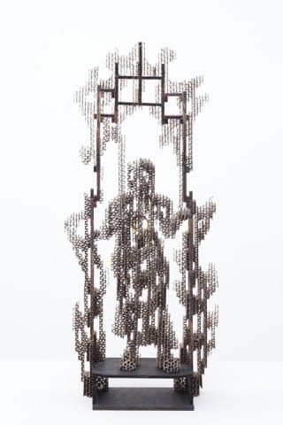 This aluminium sculpture is the first component of Berlin Buddha. The second component is an ash Buddha made by casting dry ash to the interior of the aluminium sculpture. These two sculptures will be installed facing each other. As time goes by, the environment will affect the work, as the floor will tremble with movement, ash Buddha will also change and fall into piece.