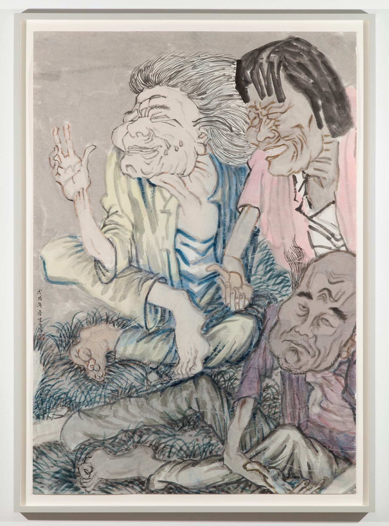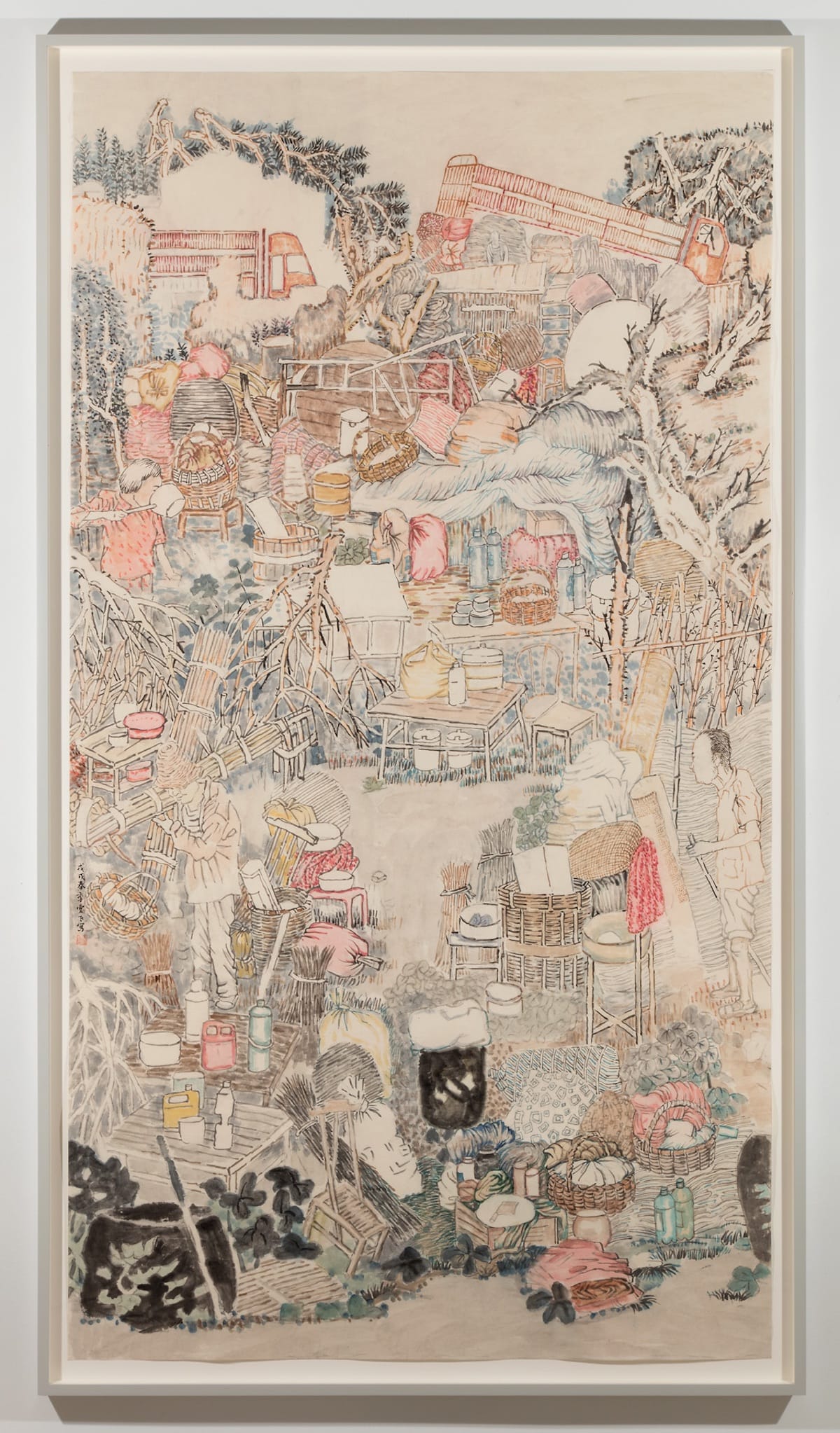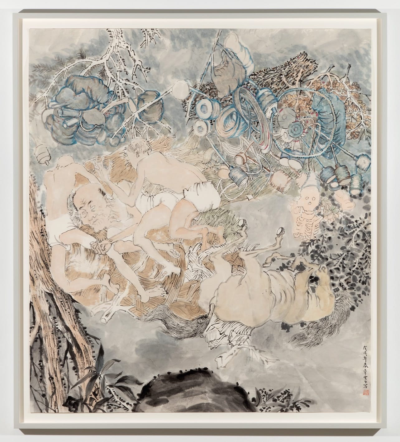In “Tumbling” (2017-18), Ji depicts an upside-down horse and three men in their underwear sleeping on a straw mat as they plummet past tree branches, where wrapped bundles are snagged. A grinning skull is also visible. Are the men dreaming? If so, does it mean for them to live in a world where three men must share one straw mat at night? Is it a collective nightmare? Ji is a narrative artist who invites the viewer to complete the story he has depicted in muted colors. His mastery of painting in watercolors and inks is inimitable. It seems to me that the future of painting does not lie in parody, citation, or commentary. By using the kind of humble means – brush, paper, and colored water — that the villagers, who live without access to modern conveniences, would be familiar with, however educated or uneducated they might be, Ji aligns himself with his subjects. By being attentive to his subjects’s ghost stories, insults, and reliance on rumors, Ji recognizes their irrepressible disobedience. For him, it is a small sign of hope.