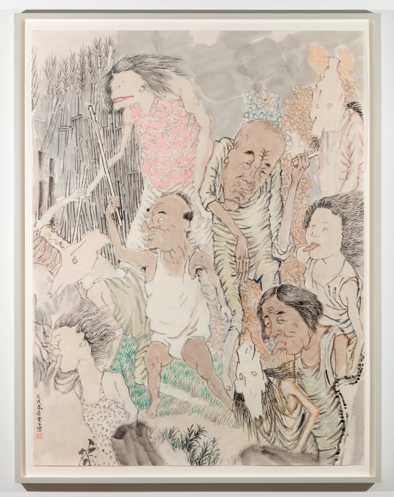 In “They Come Out Together” (2017-2018), nearly all the men and women are sticking out their tongues, a childish act of defiance. Others are wearing masks. It could be a Halloween party full of slightly inebriated revelers, but it is not: it is a group of powerless people angry about what is happening to them, which Ji never discloses. Rather than singling out the cause of their anger, as if it is only one thing, the artist is sympathetic to whatever acts of group insolence the villagers can muster. He knows that only in such childish behavior and concerted efforts can the individual feel relatively safe, even if that sense of security is at best an illusion. In “The Underworld Petitioners” (2017-2018), three poorly dressed individuals are seated on the ground, imploring an unseen authority. By keeping the authorities offstage, Ji depicts a Kafka-esque world that has become irrevocable fact. The oversized, grimacing, distorted faces test our capacity for sympathy, which I think is part of the meaning that the artist is getting at. How do we feel about what happens to others who live largely invisible lives?