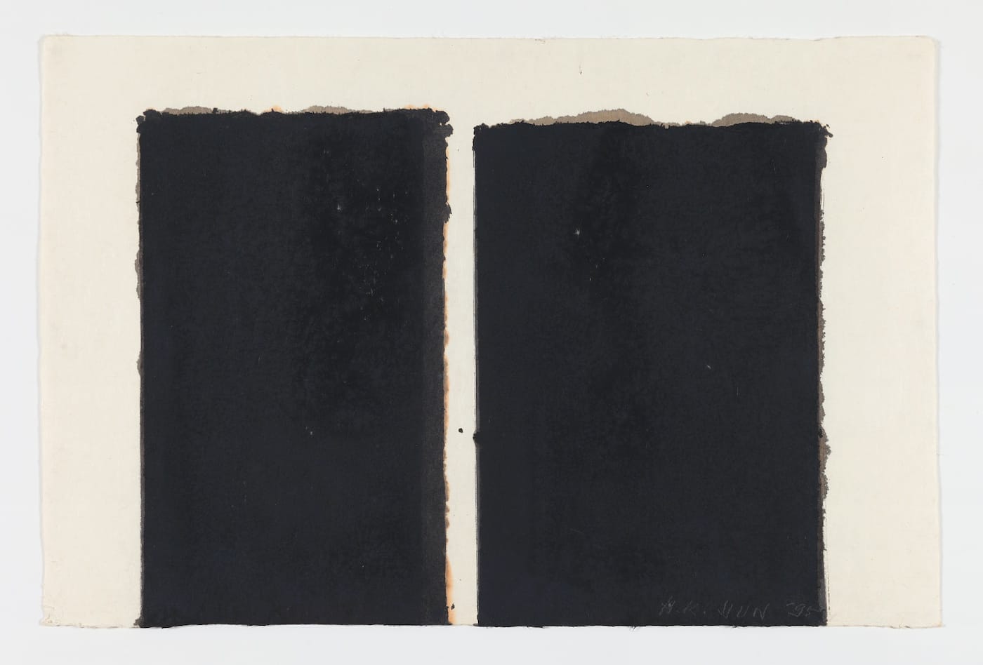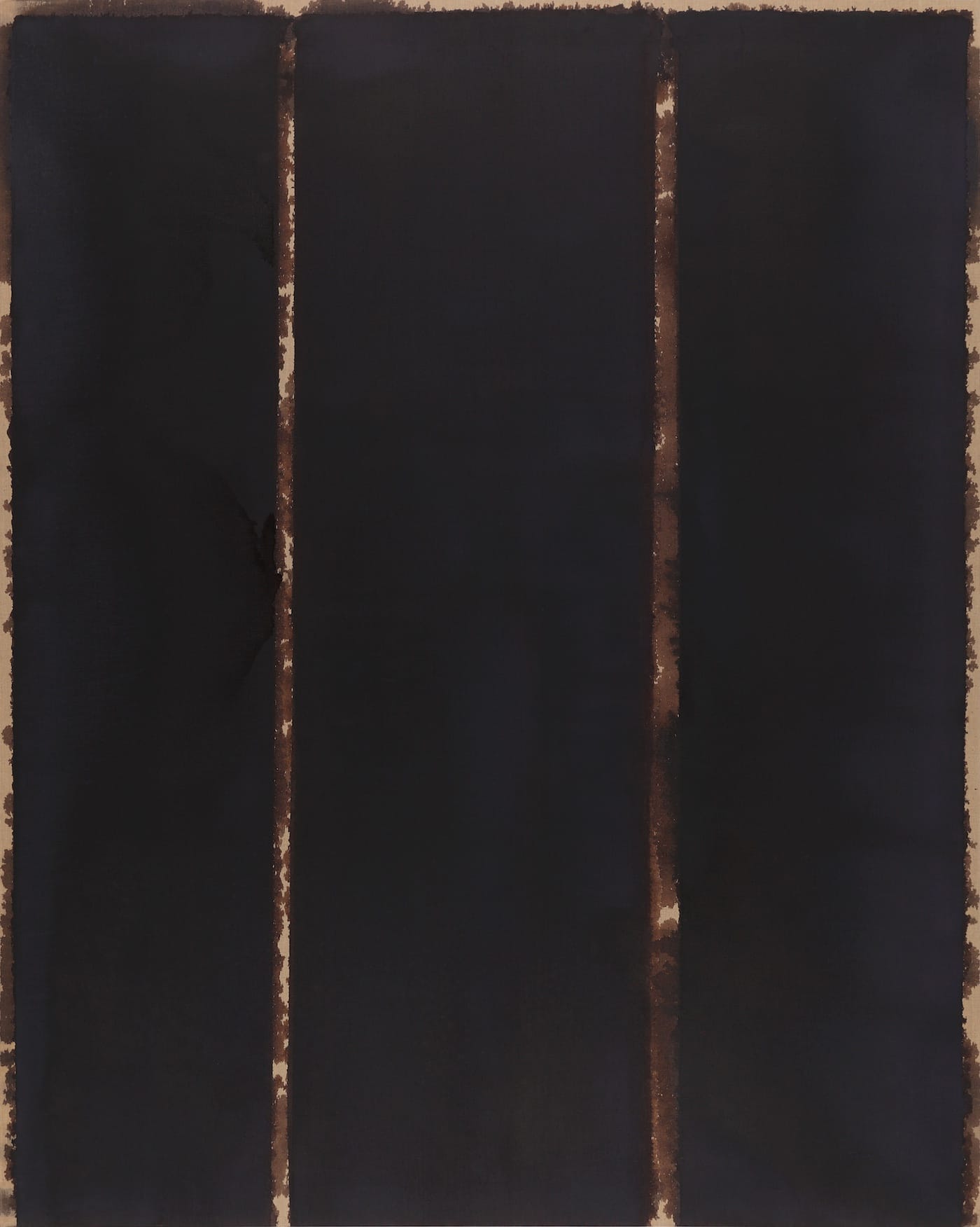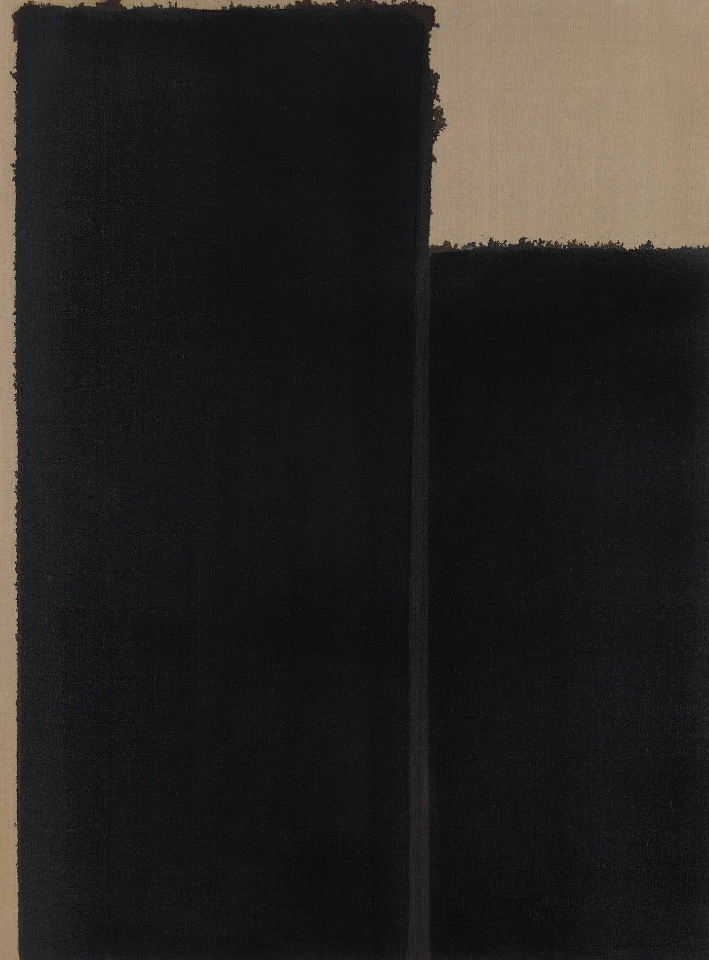 When umber is mixed with ultramarine blue, you get black, the result of two complementary hues canceling each other. Over the 30 years Yun worked this way, his portals have run from ghostly to solid darkness. In this exhibition, his expanses of black thirstily drink in the light, like parched animals. Are the portals gateways into the darkness that awaits us all?