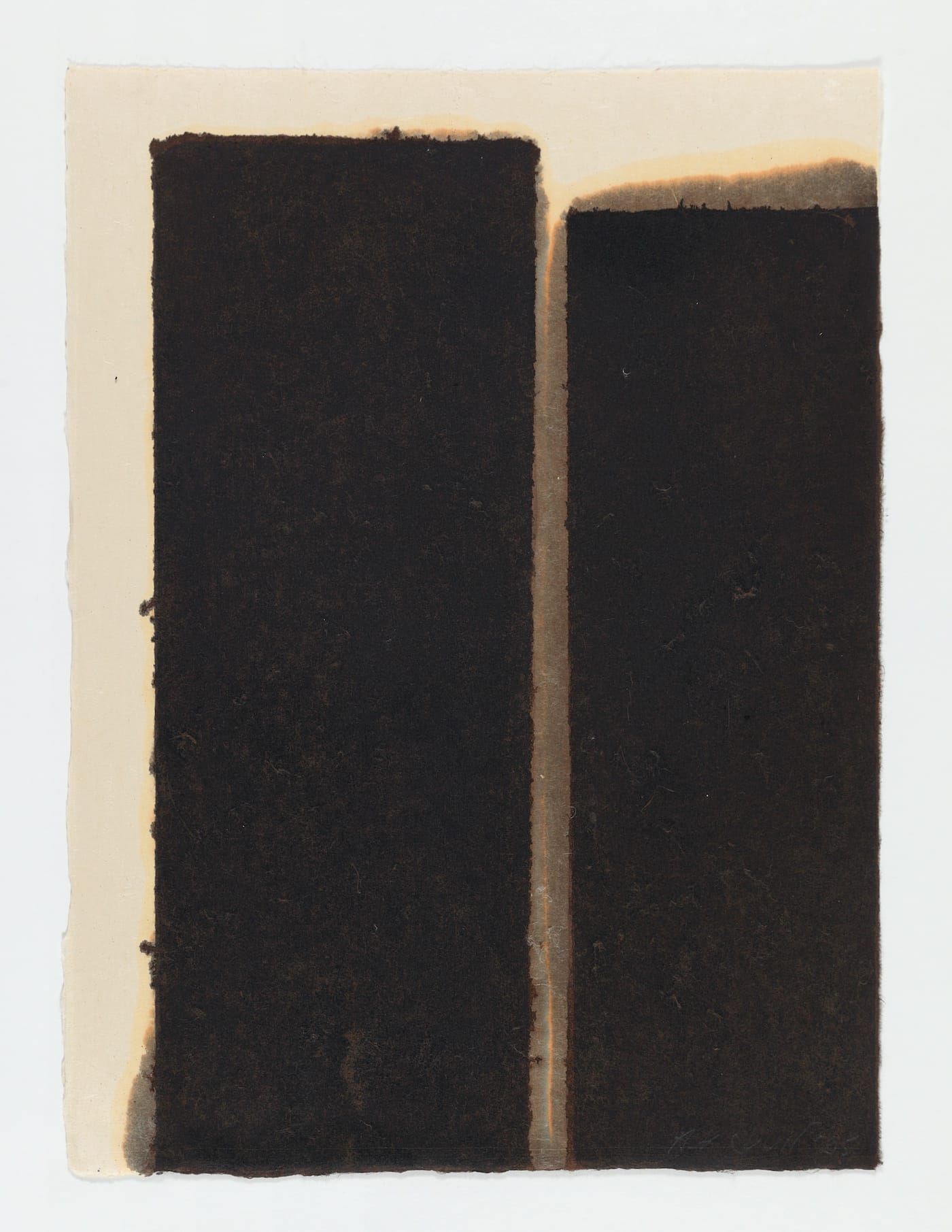 Yun’s portals are the raggedy edged, geometric forms he achieved by working on the floor and applying diluted layers of burnt umber and ultramarine blue with a large brush until they turned mostly black, letting them soak into the support like ink into paper or rain into dry earth. He both draws with his loaded brush and negates what he has done. This is the opposite of the calligrapher in search of the perfect stroke. Yun doesn’t seem to be searching for something and yet he is.