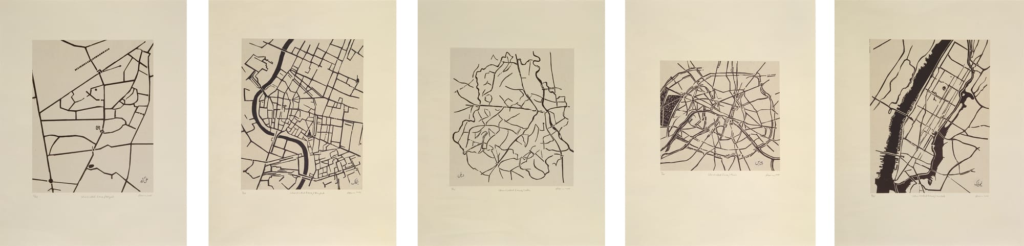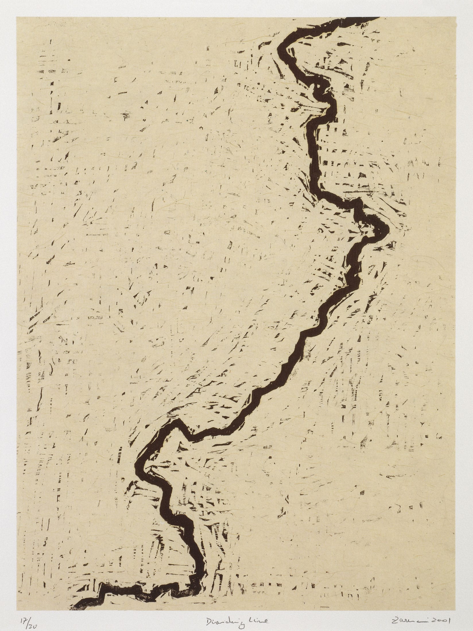 Zarina Hashmi, known professionally as Zarina, lived a peripatetic life. She was born in 1937 in Aligarh before Indian Partition, moved with her Muslim family to Pakistan in the wake of that traumatic upheaval, and subsequently lived, studied, and worked in Bangkok, New Delhi, Paris, Tokyo, and many other places besides, before her death in 2020. Her oeuvre — spare, post-minimalist prints, drawings, cast-paper reliefs, and sculptures — consistently returns to questions of mapping place, remembering home, and understanding migration. It is indelibly marked by her nomadism — sometimes chosen, sometimes forced.