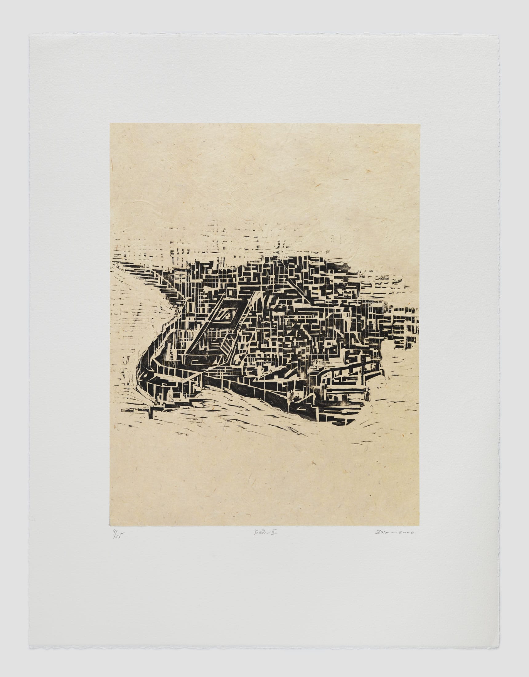 In the former, Zarina carves out the land on either side of that line in rough cross-hatches, making the boundary that arbitrarily divided communities feel more like a river, imperfect and blurry at its edges — an active, shimmering place. In the second, the border is rendered via a series of fine, vertical lines etched into her block, not a river but a fault line in a landscape plunged into darkness. In both of these images, there is no difference between what exists on one side of the division and the other. I can think of no more devastating commentary on the cruelty of nationalisms than this.