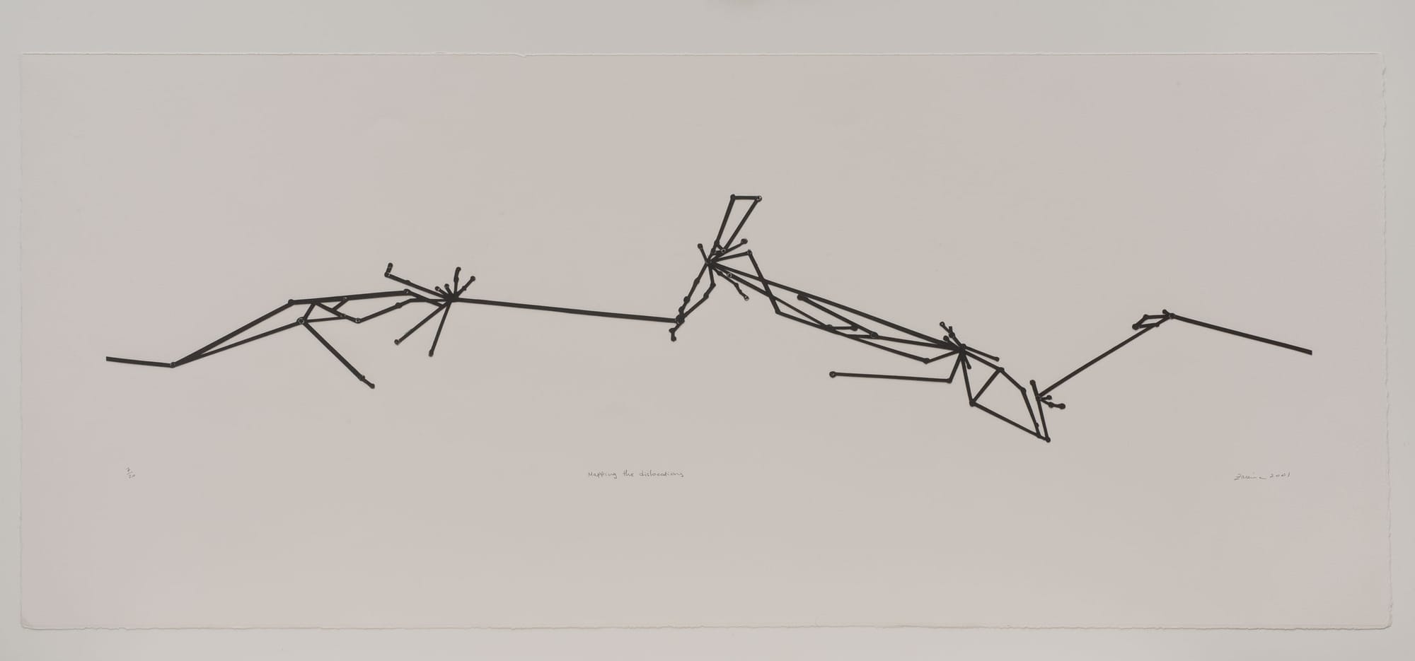 Two woodcuts on handmade paper, “Mapping the Dislocations” (2001) and “Cities I Called Home” (2010), mark her unique position in different ways. In the first, her geographical biography is rendered in a single, jagged route full of switchbacks and overlaps, the dots at the end of its segments (representing her stopping points) less important than the propulsion of the line. The second, a portfolio of five sheets, is a cartographic schematic of her waystations. Importantly, it frames Aligarh as equivalent to all of the other cities represented (Bangkok, Delhi, Paris, New York) rather than a nostalgic point of origin, a radical departure from typical representations of diasporic experience in art and literature.