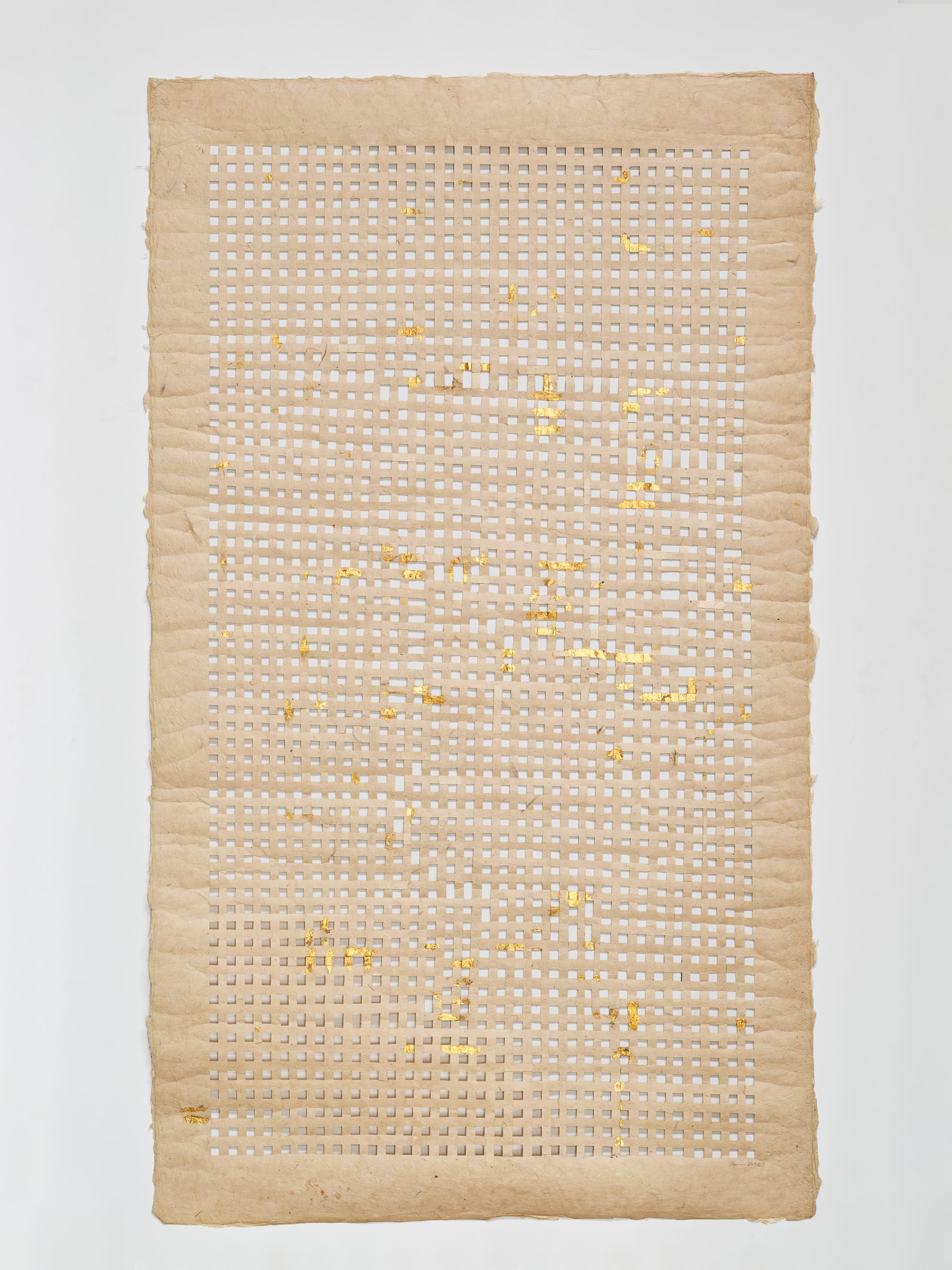 Cities are destroyed (“Destroyed City,” 2017) or effervesce into memory (“Delhi II,” 2000). Houses are made small (“Folding House,” 2014), or spin (“Spinning House,” 2013), or reduced to shadows (as in the cut paper and gold leaf “Shadow House VI,” 2006). And above it all is the sky. “Fold in the sky” and “Beyond the Stars,” both from 2014, envision the galaxy above as both boundless and bounded. The former imposes a vertical horizon on the hundreds of tiny, luminous dots, each representing unknown suns, while the latter overlays a square of stars with collaged gold leaf disks. But here, the gold disks exceed the frame, pointing us to something more that cannot be mapped — something beyond, even, infinity.
