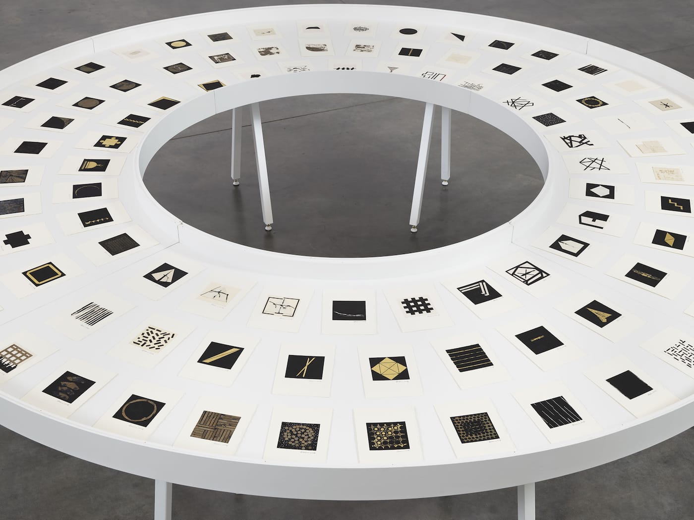 While Hilma af Klint’s powerful abstractions at the Guggenheim New York write a new subtext for art history, Zarina’s intimately scaled exhibition treads a similar terrain of spirituality and subjectivity. Encompassing 24 works and a large, circular vitrine with 100 miniature collages titled “The Ten Thousand Things III” (2016), the show presents a distinguished selection of the New York-based artist’s minimalist abstractions from the past decade.