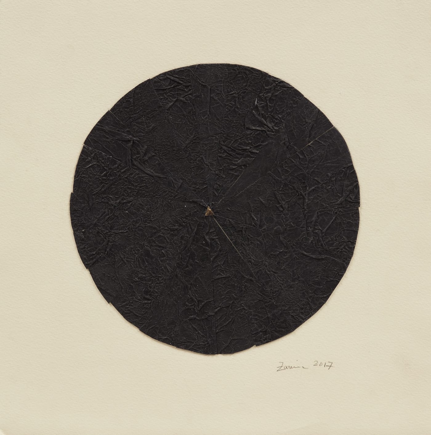 I am particularly moved by the artist’s use of black. Her work has always been minimal in its formal sensibilities, with a symmetry between light and dark. But in this show, the darkness spills over to reveal the light within. In a curious, untitled wall-hanging work from 2017, a tiny, golden triangle is affixed to the center of a black circle made with crushed paper and sumi ink. In Tantric symbolism, a black circle with a central triangle translates to the Goddess Kali, the deity that controls the cycles of time, and delivers moksha, or liberation from rebirth.