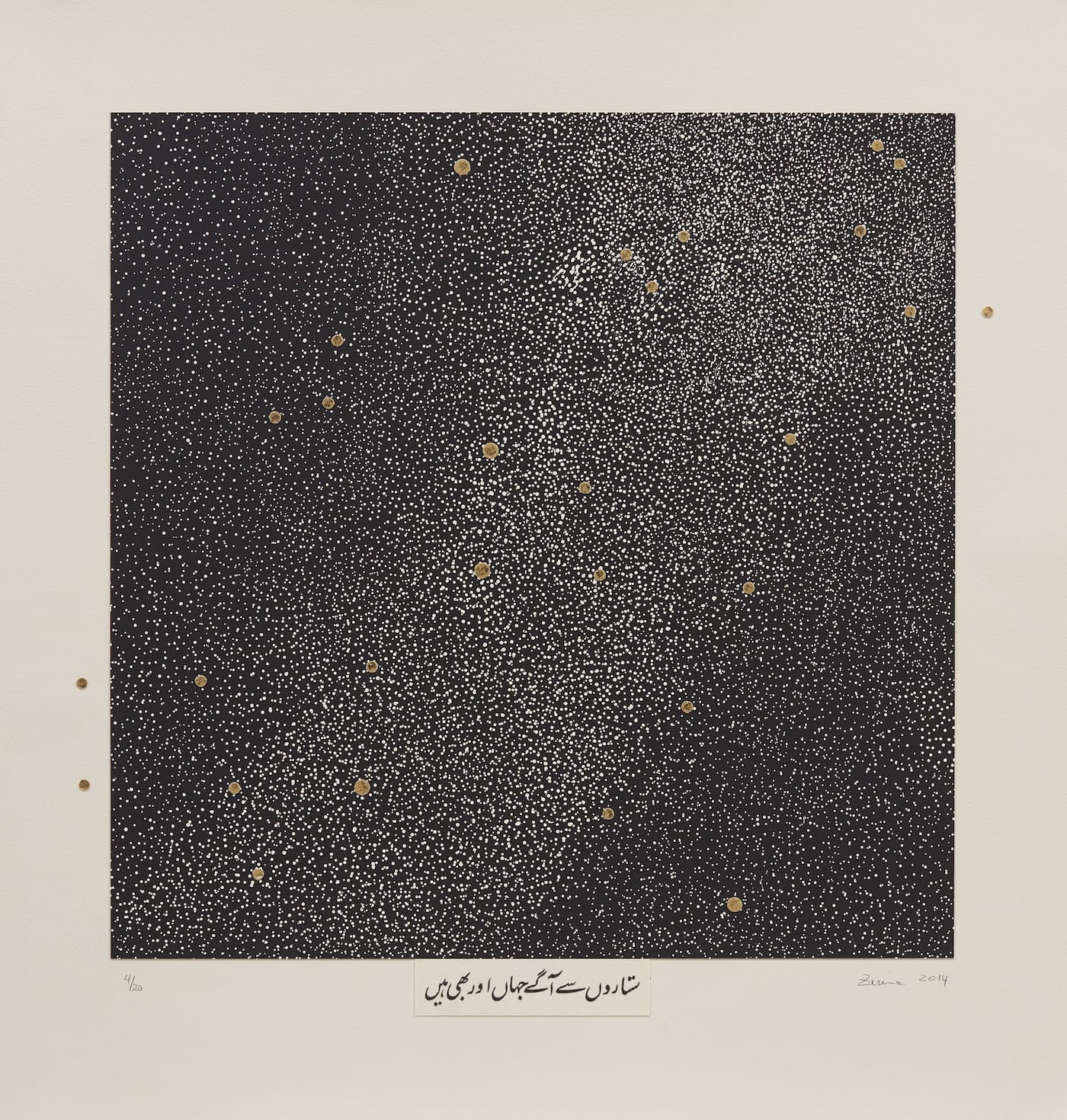 What resonates much more strongly in this show are the evocations of cosmic happenings, abstract and natural phenomena, and architectural details. In a wonderful collage, “Beyond the Stars” (2014), Zarina’s customary formal precision gives way to fluid systems. For a moment, she loosens her grip on the grid. The night explodes with stars. Golden blots made of 22-karat gold leaf punctuate the inky, black sky like comets from a distant galaxy, and spill over, out of the frame. Spiritual depth finds expression in willful play. A caption below the image, in Urdu, reads “There are other worlds beyond the stars” from a poem by Iqbal.