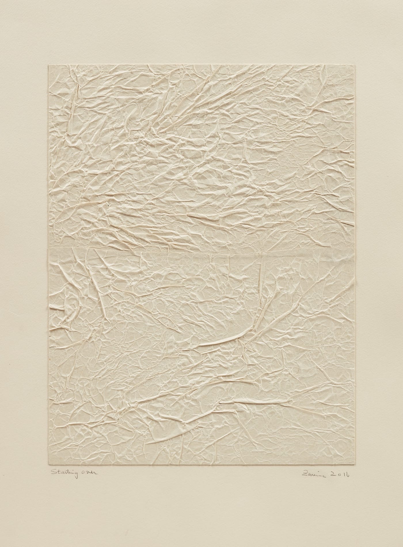 There is a beginning too. The most spectacular work in the show, called “Starting Over” (2016), is also the barest. Two sheets of crushed Indian paper, pasted together on a warm tone buff paper, form an uneven horizon line where they overlap. I stood in front of this work for a while, in awe. Here is Zarina’s “zero-point”: the moment at which all images have been absorbed, revealing the creases of age ready to rebirth itself with entirely new forms. There is nothing; and yet, there is everything.