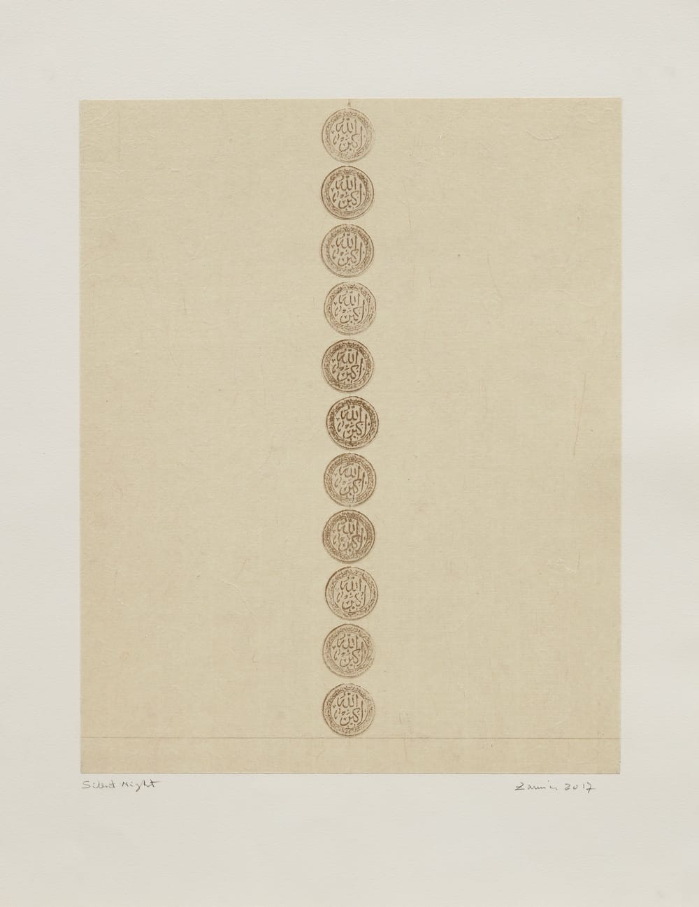 “Silent Night” (2017), the first work one comes upon in the gallery, hanging on the anterior wall, is also the latest work, chronologically speaking. It’s an image of a curious totem of 11 coins made through rubbing. The totem forms the number 1, a straight, vertical line. It’s interesting to note that in ancient systems of numeration, whether Roman numerals or the Hindu-Arabic system, from which European numbers later derived, the number 1, is always a version of this straight, vertical line. Minimalism, if viewed through this lens, could take on radically new meanings.
