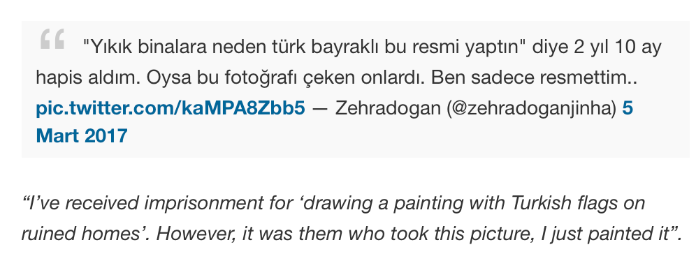 Though she was eventually acquitted of these charges, Dogan was still sentenced to prison for her painting and her coverage of either the notes or grades of a 10-year-old child — there are conflicting accounts about the latter. Reports say that Dogan had been working in and reporting from the Nusaybin district of Mardin province, a mostly Kurdish region where a strict curfew had been imposed after the district was largely destroyed by government forces. These military campaigns have reportedly been instigated by President Tayyip Erdogan who has implemented a crackdown after last year’s failed military coup. Since then the Turkish government has closed three news agencies, 16 television channels, 45 newspapers, 15 magazines, and 29 publishers, while 47 journalists were ordered detained by police, according to the government’s official news sources. It seems likely that agents of the government suspected Dogan of being a member of the Kurdistan Workers’ Party (PKK), a group that fights for Kurdish rights in Turkey, which the government has labelled a “terrorist organization.”