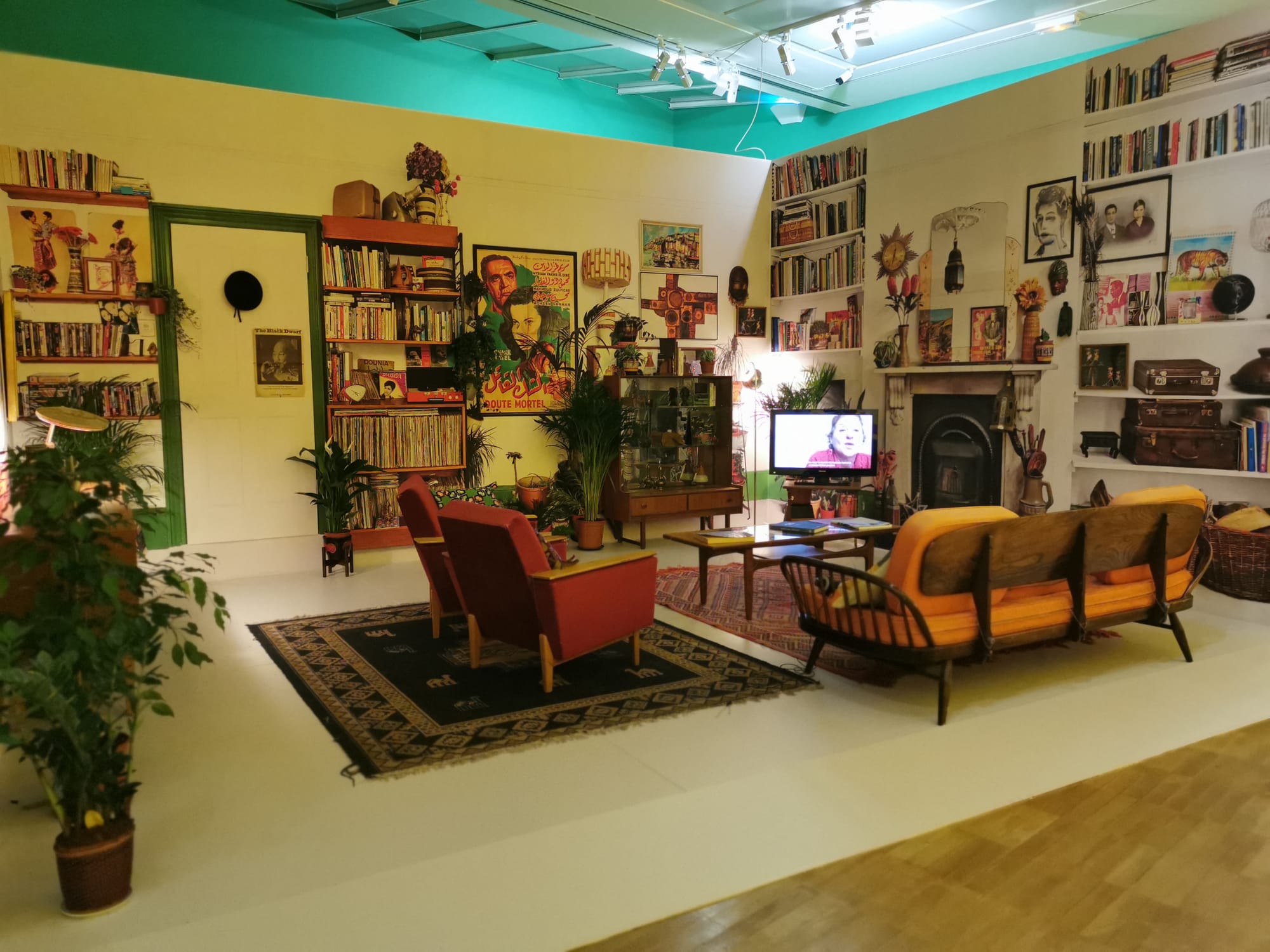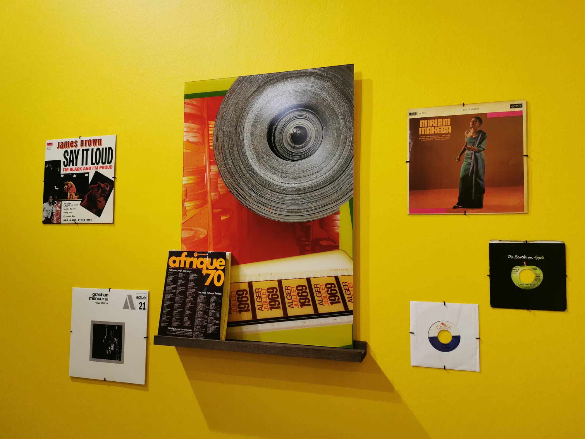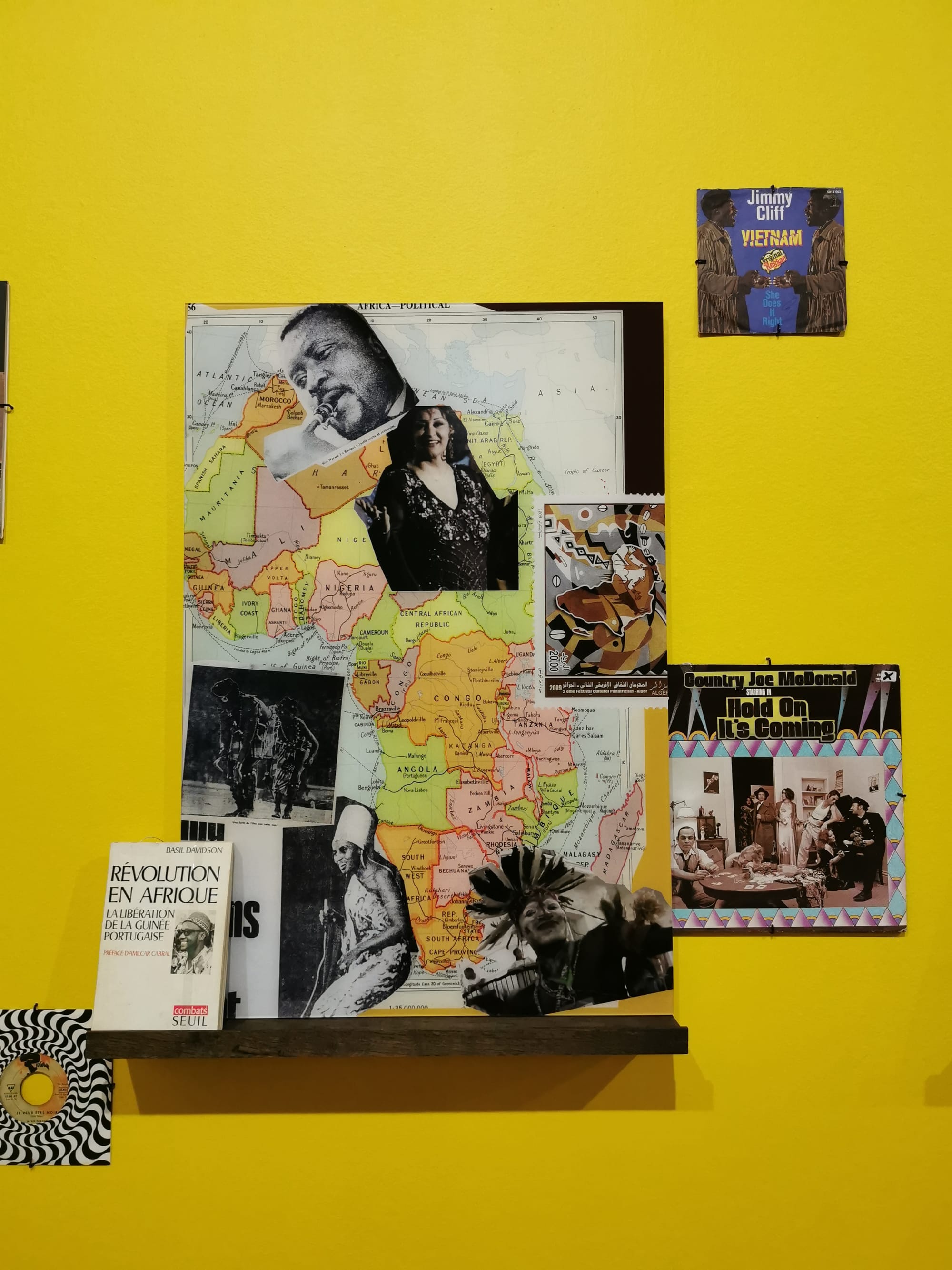 Composed of four separate scenes, the installation explores the sense of utopia that accompanied the PanAf festival through various media, including footage from 1960s militant films that Sedira uncovered in the film archives in Algiers, as well as an impressive collection of other archival materials (for instance, magazines, newspaper clippings, and Sedira’s own collection of protest songs on vinyl records), with which the artist created a large collage on a bright yellow wall. The work’s central element is a life-sized diorama that recreates Sedira’s own living room, complete with her furniture and personal objects such as photographs, books, and records. Taking a seat on the couch, viewers can watch a video on the TV screen that features Sedira’s friend and scholar Nadira (2019) recounting her experience of the PanAf. Similar to the lighthouse keeper’s personal narrative in the first piece, the oral histories here expose the idea of a stable collective memory as a myth. If anything, collective memory is the compilation of individual memories, demonstrating the impossibility of official memories, or official histories.