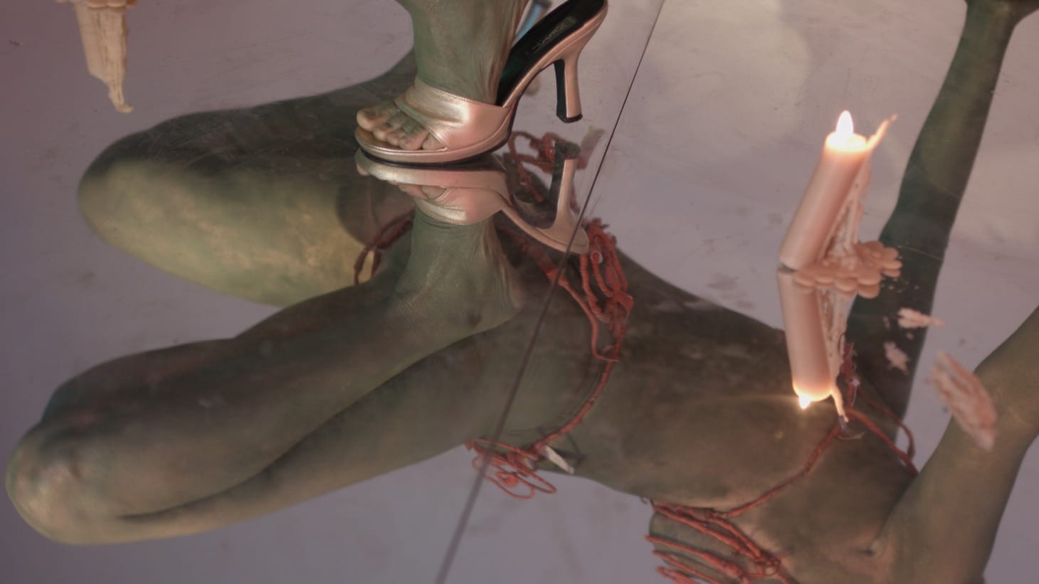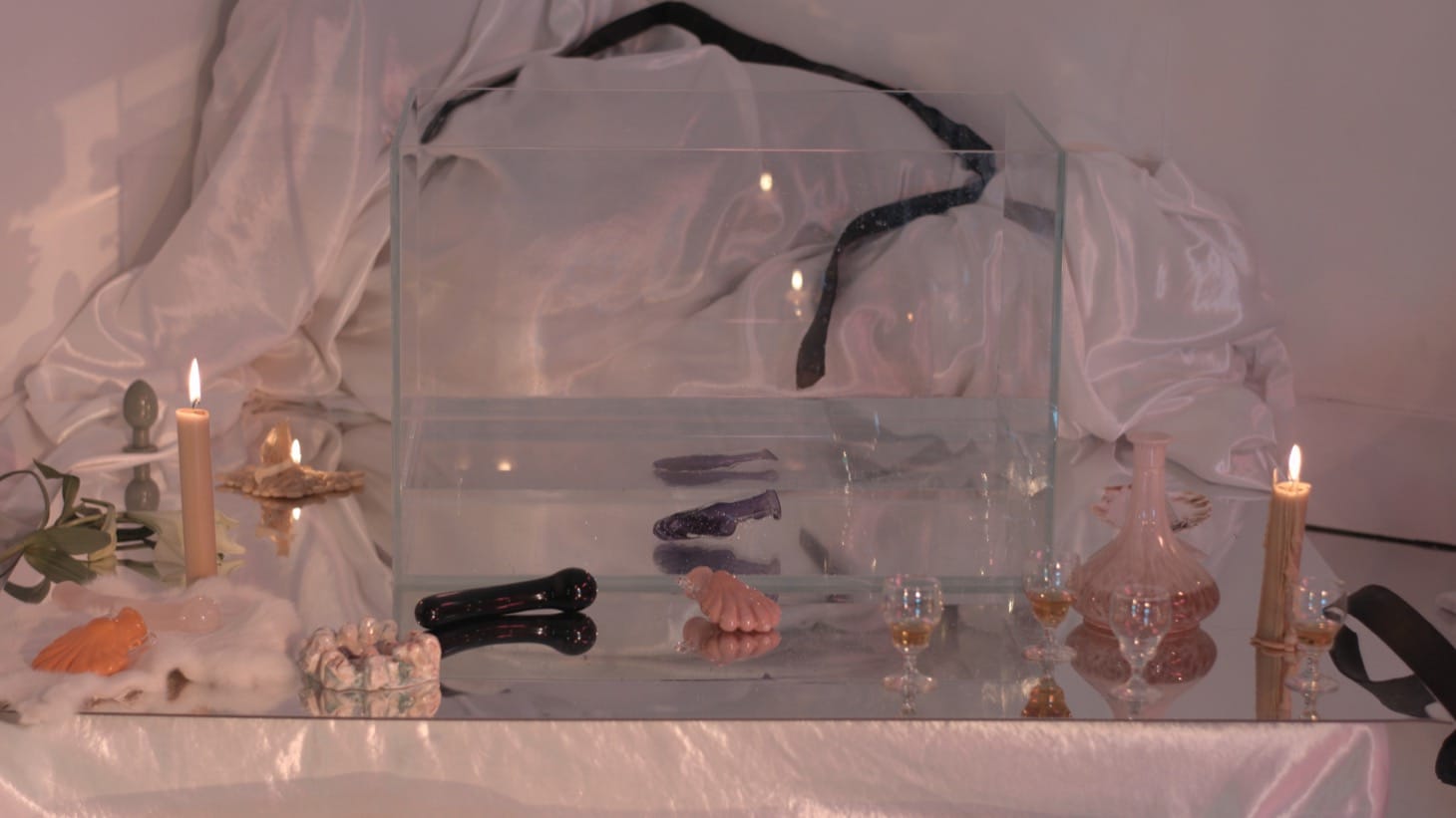 LONDON — Zoe Williams is no stranger to exploring sexuality, having written her masters dissertation on the history of the dildo. Another object of sexual desire forms the premise of her latest show, Sunday Fantasy. The exhibition’s central object is a recreation, in glass made by Williams, of an ancient Roman perfume bottle now held in the British Museum. In an attempt to mess with the staid, patriarchal Western perspective that museums present of history, Williams created a fictionalized back story for the object from a perspective that better spoke to her. In what she, in conversation with Daria Khan, termed “something akin to a ‘70s B-movie storyline”, Williams’s bottle is now possessed by the spirit of its previous owner — a lesbian priestess from ancient Rome — and has the power to realize one’s wildest fantasies when rubbed on the nape of the neck or on the genitals.