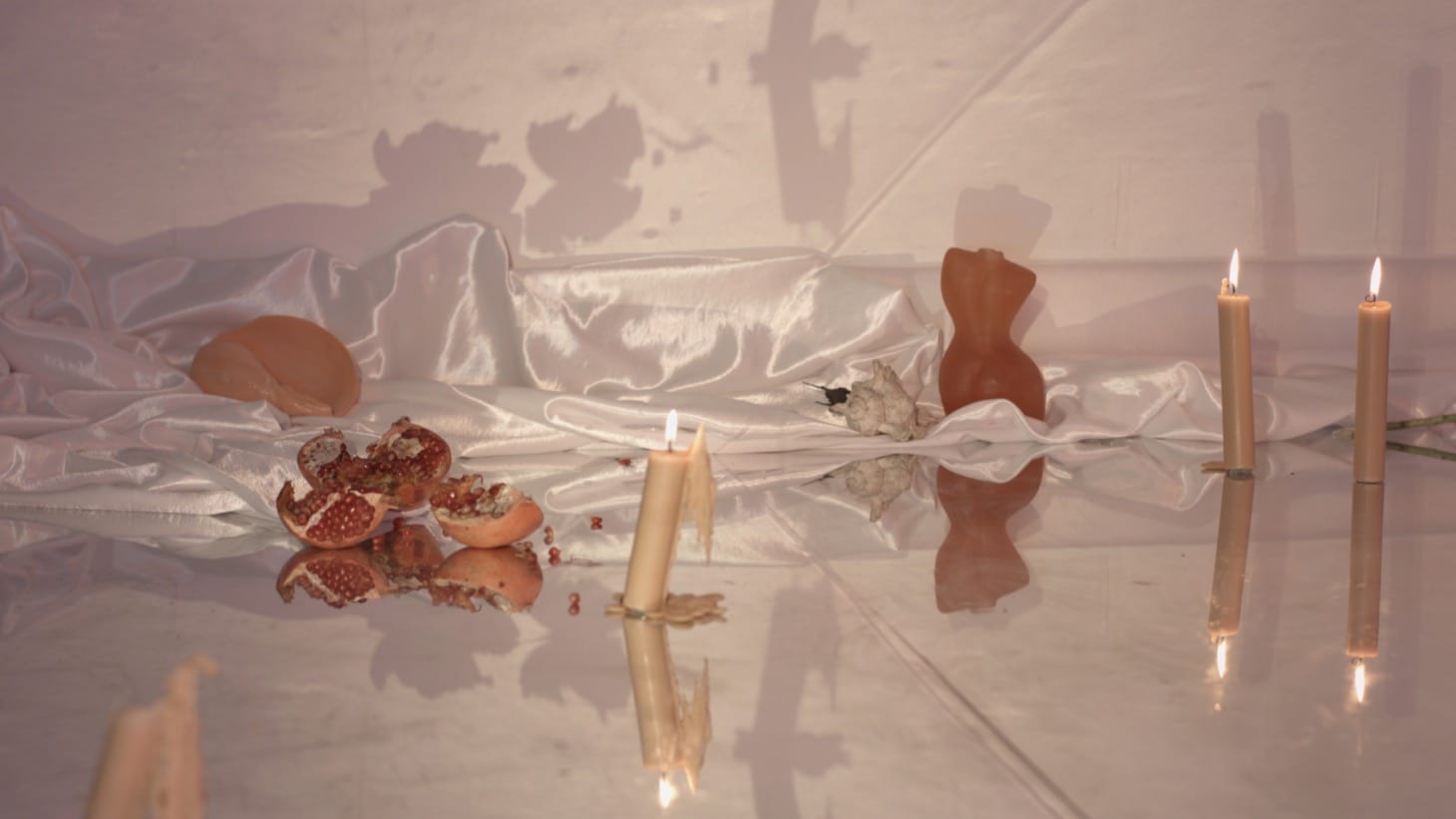 Visitors to this exhibition may sit and watch this film on the normal viewing benches installed in the gallery, but they might instead choose to recline on the copious pillows, rugs, and throws that litter the viewing room and spill out into the exhibition’s other rooms — the very same furnishings featured in Williams’s film. Through this, we are overwhelmed and enveloped by the fantasies explored by Williams, and the line between where the exhibition visitor and exhibition itself is blurred. One is transformed from a mere viewer into a voyeur, perhaps even a participant. One feels almost as if one is as much a feature of Veronica Malaise’s various fantasies as those who are on screen. This feeling continues when one moves into the exhibition’s adjoining rooms, and one is confronted with not only more props and objects from Williams’ video, but the very room the film was filmed in. And there, in the center of a mirrored table — there is the priestess’s bottle itself. One almost feels that if one reached out and touched it, an immediate transportation into the fantasy world of Veronica Malaise might occur.