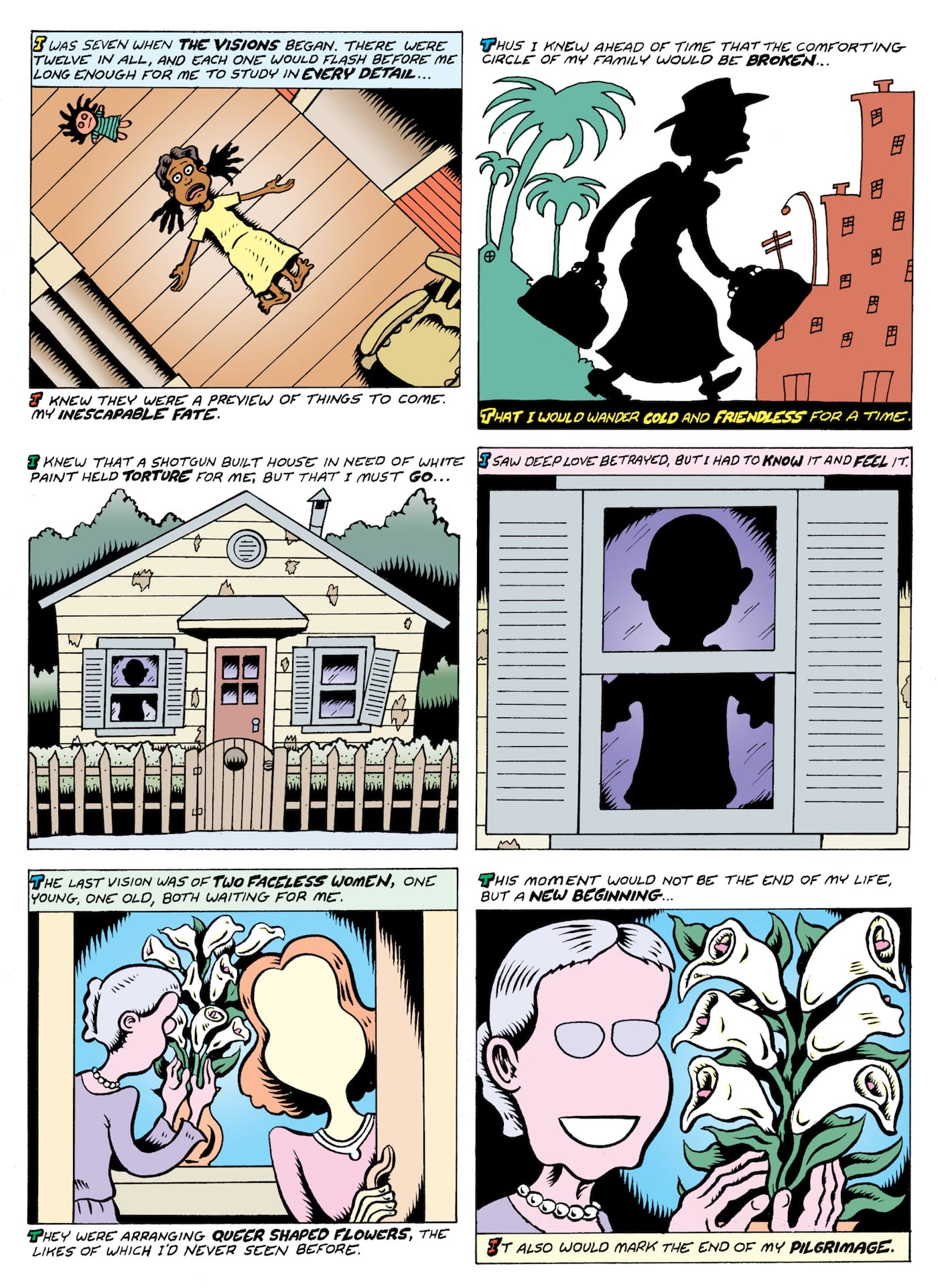 But the real failure of Fire!! is a narrative one. Bagge’s Hurston doesn’t have many definite, sustained goals over the course of the story; the few times that she does, they are either fulfilled or abandoned almost immediately. The most egregious example of this occurs in a long midpoint section detailing her and her fellow black intellectuals’ efforts to start a literary magazine (called Fire!!), which promptly fails a few pages later. Each of Hurston’s various books receive a mention, but rarely more than once, and only Their Eyes Were Watching God is followed up on (for a scene about Hurston’s professional success, more than anything to do specifically with that book). The most intriguing and seemingly portentous event in the book — a premonition of a future meeting with a mysterious figure — is paid off disappointingly early, and to no long-lasting significance to the story. Few if any of the actual incidents of Hurston’s life are paced in a way that generates any kind of suspense.