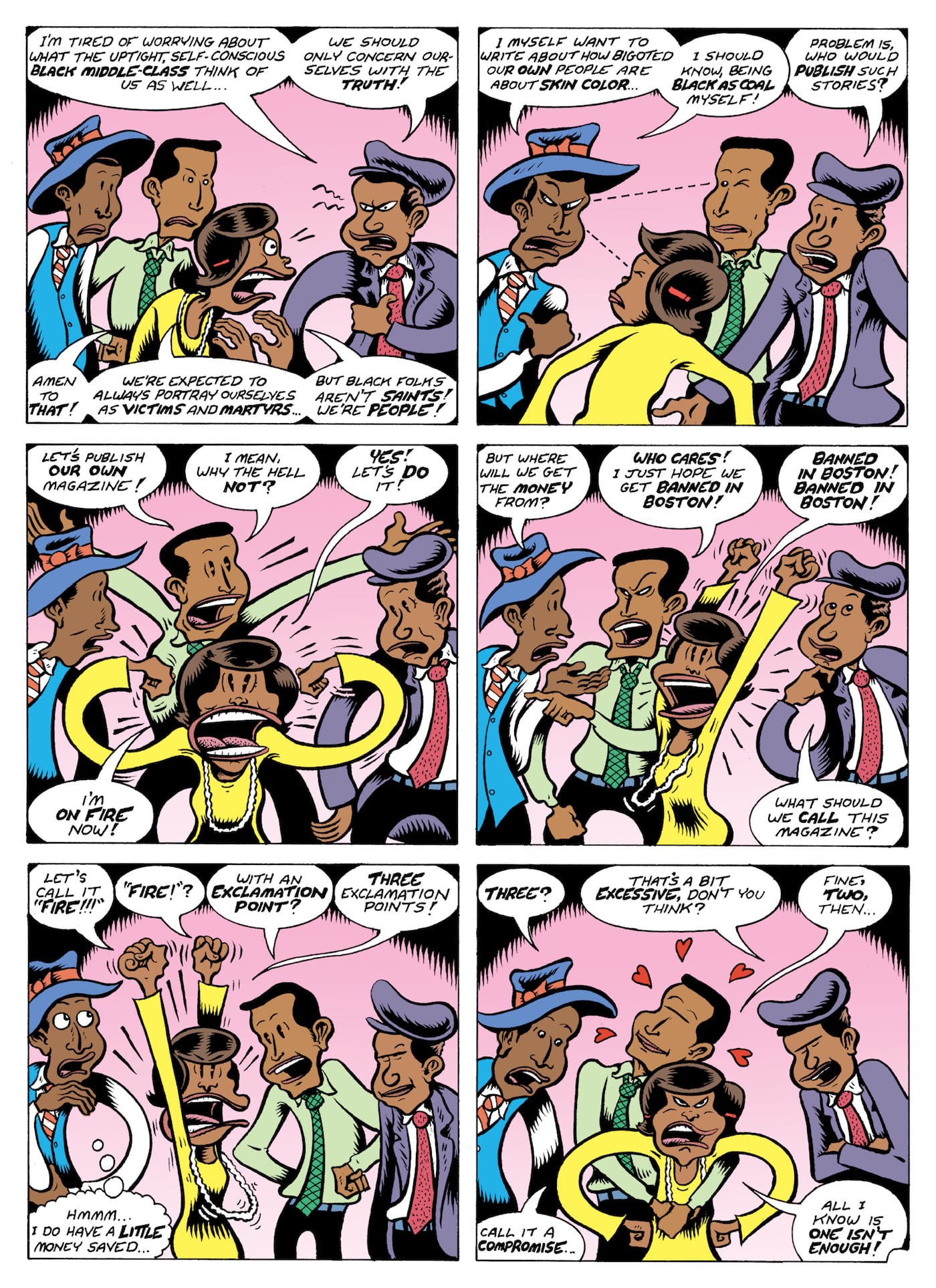Sandwiched in between these two short essay sections is the 72-page comic itself. Though it deals with the same events as both of the shorter pieces, it unfortunately doesn’t share their passion and humor, and is in many ways the weakest part of Fire!!