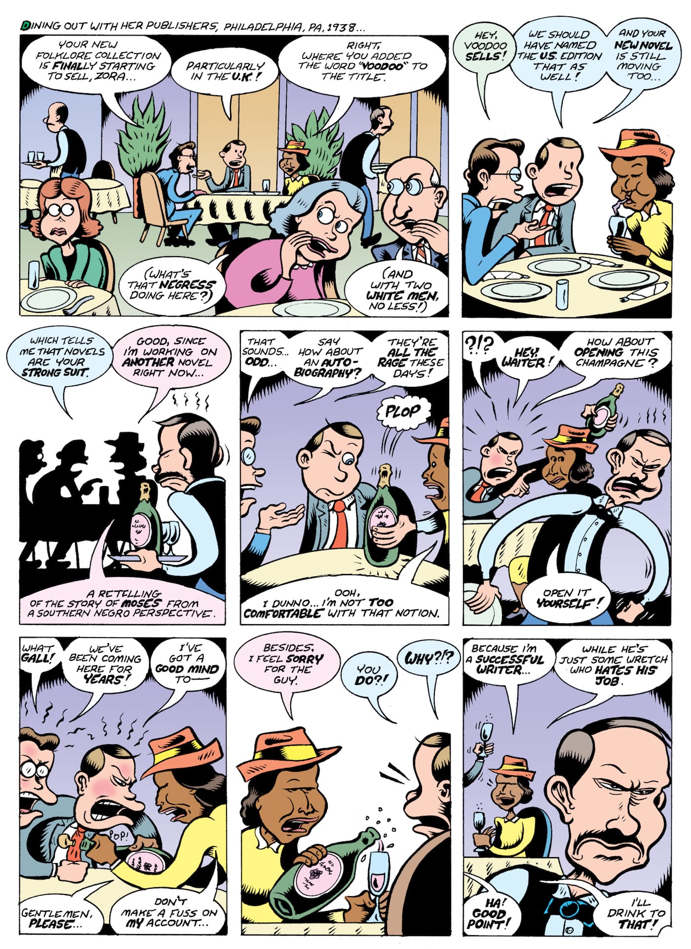 Hurston is remembered today chiefly for her 1937 novel Their Eyes Were Watching God. Others might also recall her work collecting the myths and legends of the black South along with ethnomusicologist Alan Lomax, and true fans can name some of her other novels. Bagge counts himself as a real Hurstonian, writing warmly of his admiration for her in the book’s introductory essay. “While Hurston was obviously all in favor of freedom and equal opportunity for anyone of any gender or race to speak their minds and live their lives as they saw fit (and indeed, that’s what her own life was all about), she was equally determined to pursue her own achievements on her own terms, without letting anyone else confine her or dictate the context and terms she wrote in.” His mission here is to rescue Hurston from semi-obscurity, and just as importantly, he feels duty-bound to chronicle her less-admirable personal qualities. For Bagge, this is in keeping with the guiding aesthetic of Hurston’s own work: “I feel obliged to mention that, like all humans, she was far from perfect, and her numerous character flaws are on full display in the following pages. As with her own stories, this book is ‘warts-and-all.’”