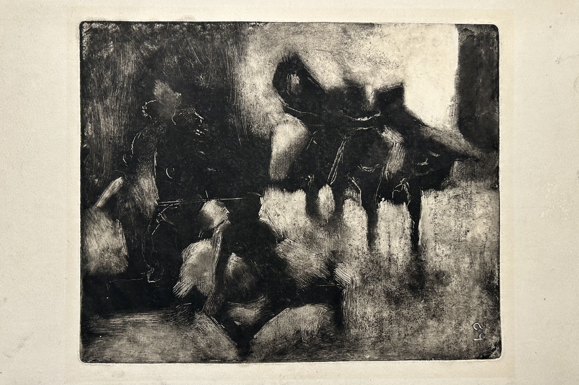 Edgar Degas’s moody monotype “Dancers in Rehearsal”(c. 1874–76) (courtesy of Galerie Martinez D.) is an exceptional example. To make it, the artist drew with ink on a metal plate and ran it through a press, creating a single painterly impression of evocative, impressionistic figures that still remain recognizable as the artist’s iconic dancers. (The artist was so obsessed with this messy medium that his friend Marcellin Desboutin famously described Degas’s monomania for monoprints as “swallowing him completely!”)